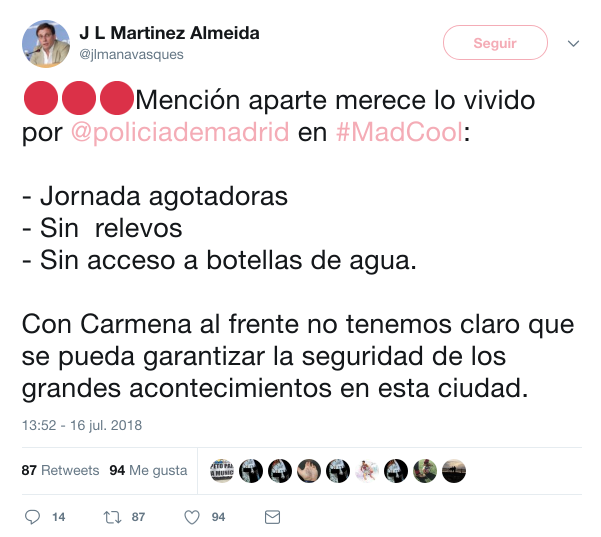 Tweet Mad Cool de @jlmanavasques portavoz del grupo municipal popular del Ayuntamiento de Madrid.
