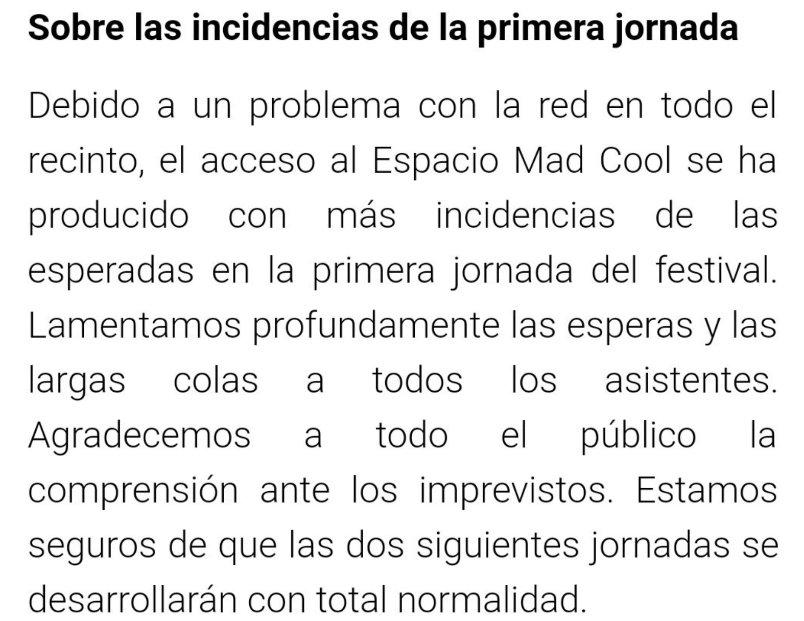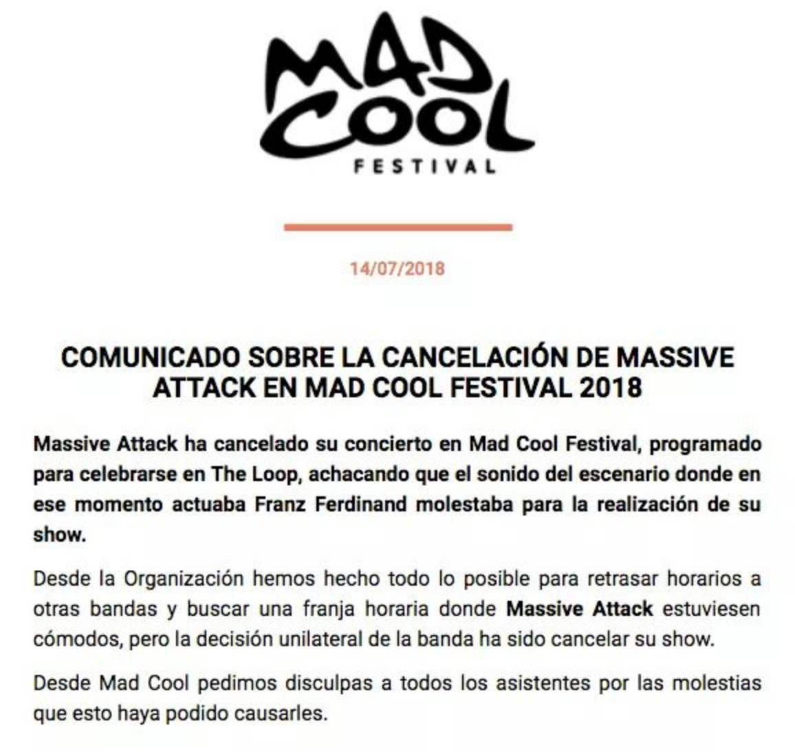 Tal y como Público menciona en su columna de opinión, las críticas de muchos asistentes hicieron hincapié en el hecho de que la organización tardara hora y media en ofrecer una escueta información: “Massive Attack cancela su concierto en Mad Cool justificando molestias de sonido de otro stage”. Más tarde se sucedieron otros comunicados algo más extensos en los que la organización explicaba que se había decidido «cancelar unilateralmente su actuación achacando que el sonido del escenario donde en ese momento actuaba Franz Ferdinand molestaba para la realización de su show». Esto no les pasó por suerte al BBk quienes acabaron el segundo día con las bandas programadas.